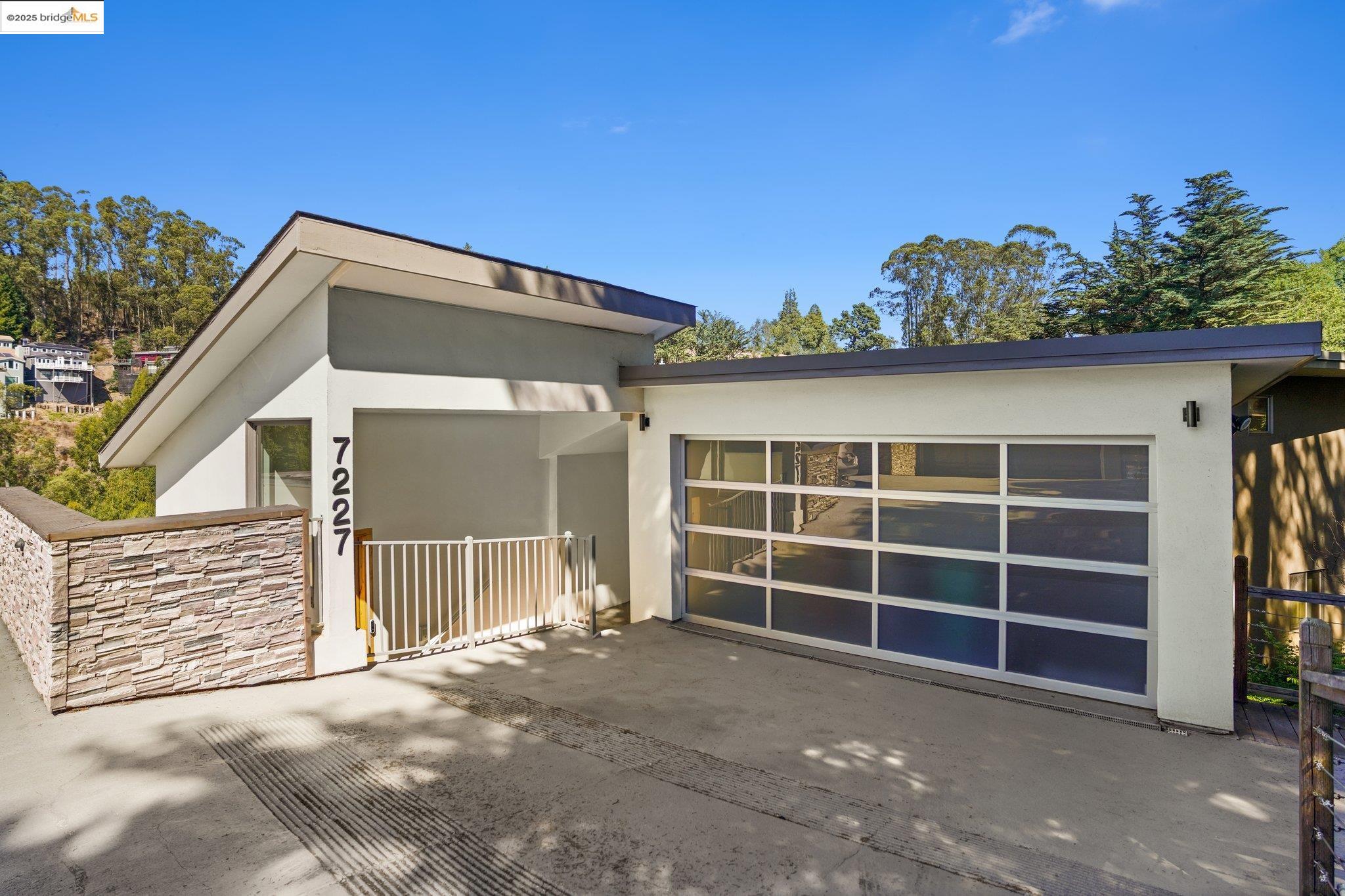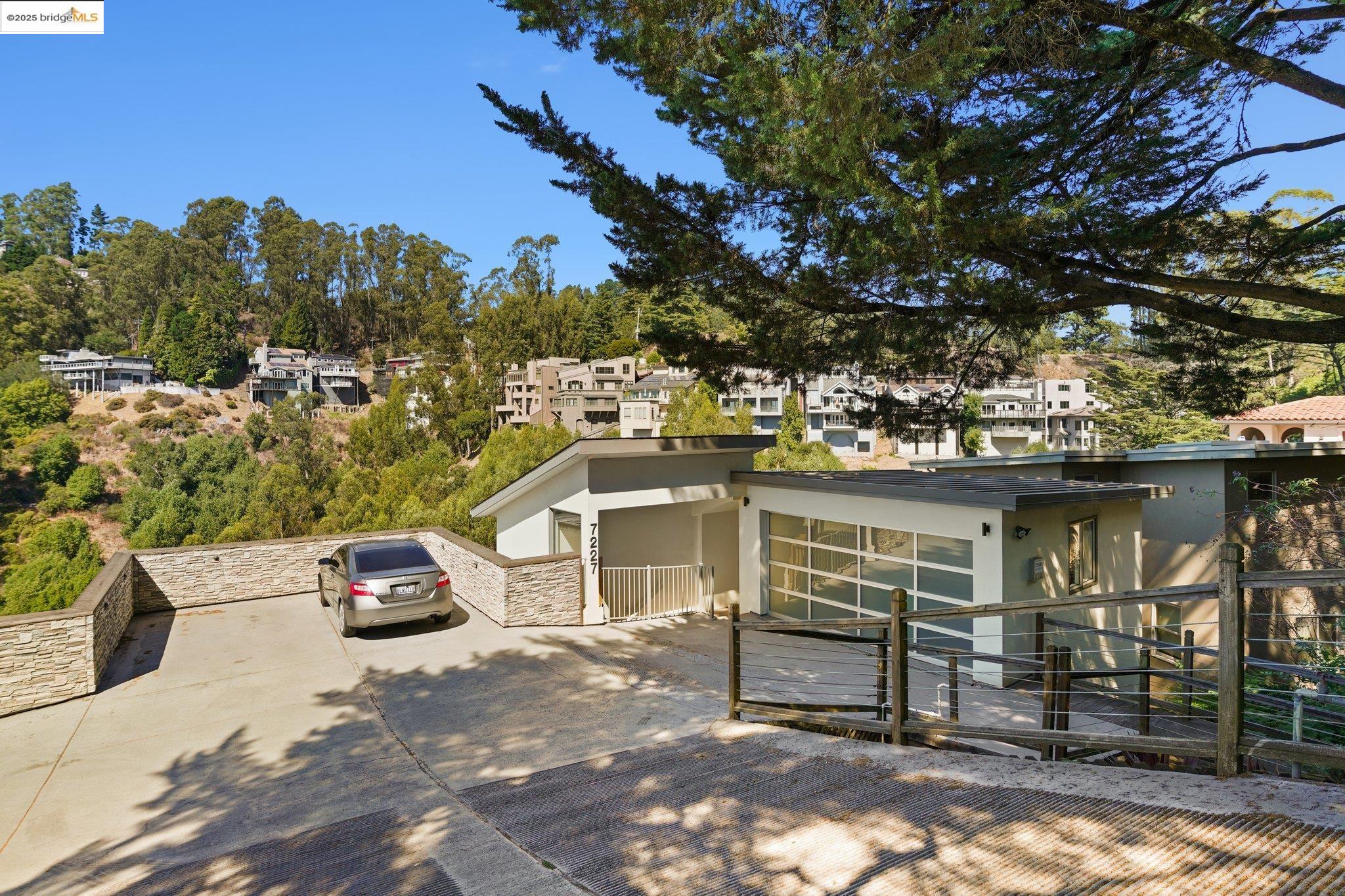 Nestled in the Oakland Hills, this 3,833 sq ft contemporary home at 7227 Skyline Blvd offers 4 bedrooms and 3.5 bathrooms. The open-concept design features a sunken living room with a modern fireplace, a gourmet eat-in kitchen, and expansive windows providing abundant natural light and panoramic views. The primary suite includes a private deck, spa-like bathroom, and custom walk-in closet. Additional amenities comprise a secondary living area, ample storage, and versatile spaces suitable for an au pair suite, office, or gym. Multiple decks, including a rooftop patio, enhance outdoor living, while proximity to Sibley and Huckleberry Regional Parks offers easy access to nature trails. Located near Montclair Village's shops, dining, and top-rated schools, this home seamlessly blends modern elegance with natural beauty.